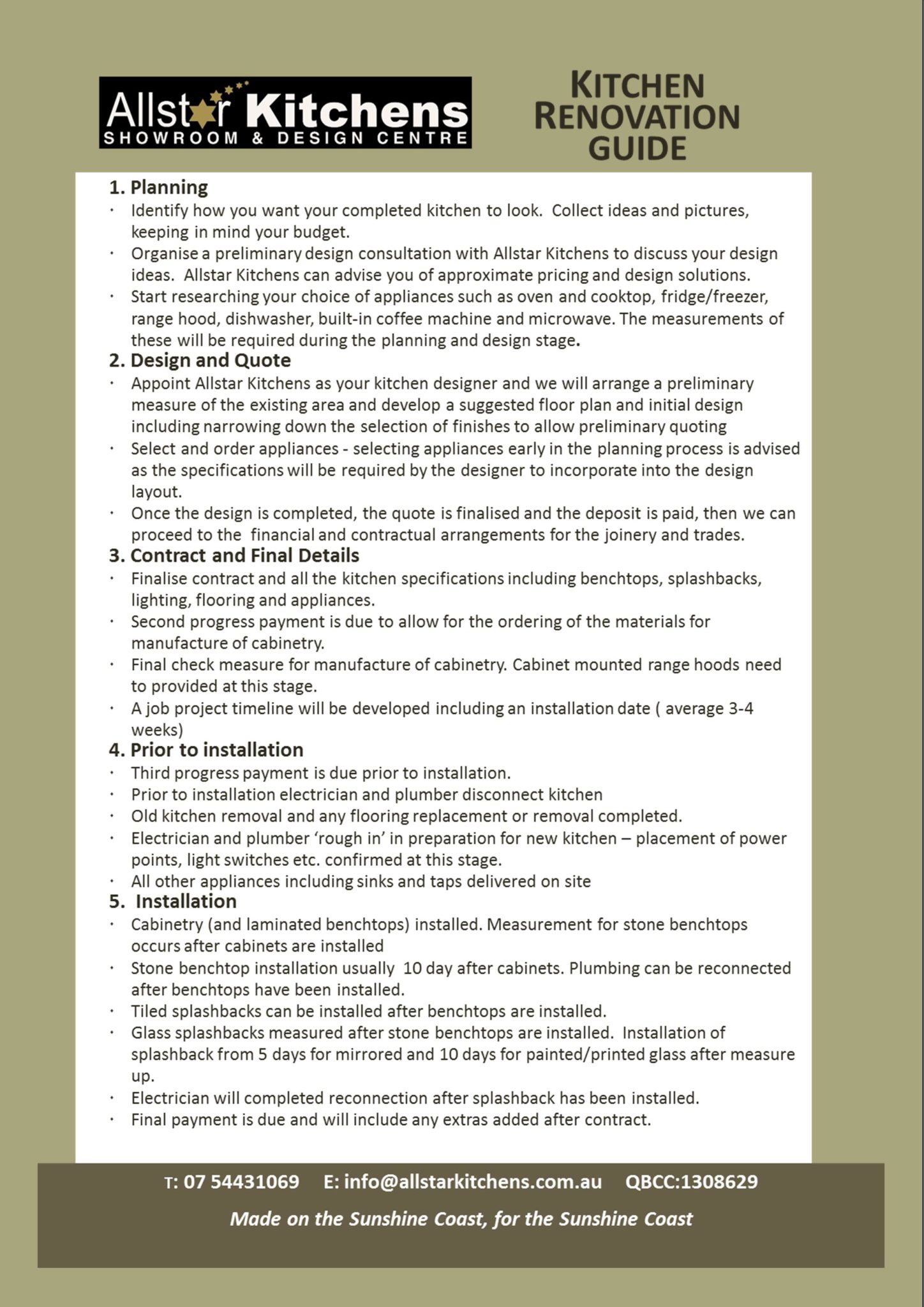 At Allstar Kitchens we know starting a renovation can feel overwhelming so we have put together some information to help you get started and get a better understanding of the process and the options available to you. Please don’t hesitate to contact us if we can help you with further questions or more information.